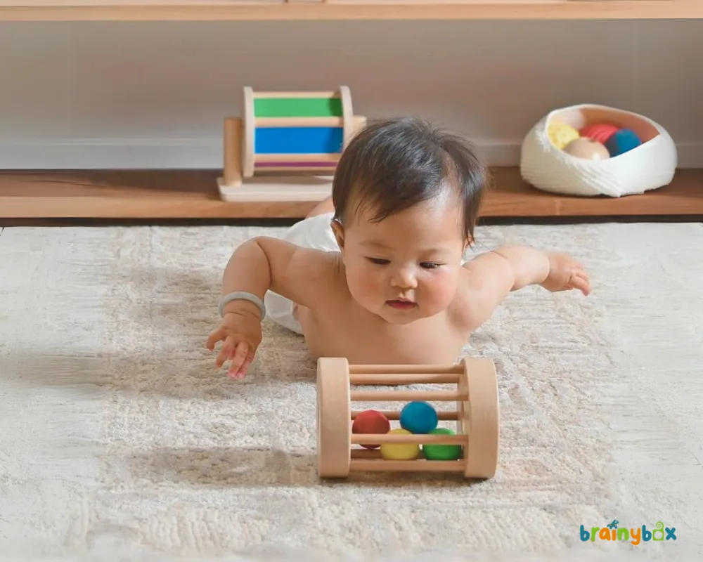 Promotes mobility and problem-solving with interactive toys, crawling-friendly items, and simple cause-and-effect games.